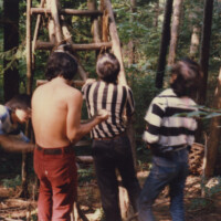 1971年に松澤と仲間たちは下諏訪諏訪大社の背後の山中「泉水入」(せんすいいり→素敵な名前!)という場所にある松澤所有の土地にツリーハウスを建て、「泉水入瞑想台」(せんすいいりめいそうだい)と名付けました。ここで71年7月に「音会」(おんえ)、72年2月に「山式・雪の会座」など数々のフリーパーティを開催、その度に様々な仲間との自由で濃厚な結びつき、「フリー・コミューン」がつくられました。